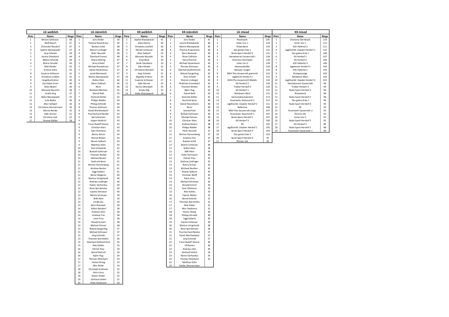 Bei den Herren starteten 67 Teilnehmer. Wie schon mit dem Luftgewehr sicherte sich Jens Kinder auch mit dem Kleinkalibergewehr den 1. Platz mit sehr guten 47 Ringen. Er war somit der erfolgreichste Schütze des gesamten Pokalturniers. Die erfolgreichste Familie hieß Maciejewski, denn Jaceck holte den 2. Platz vor Martin (beide 40 Ringe).