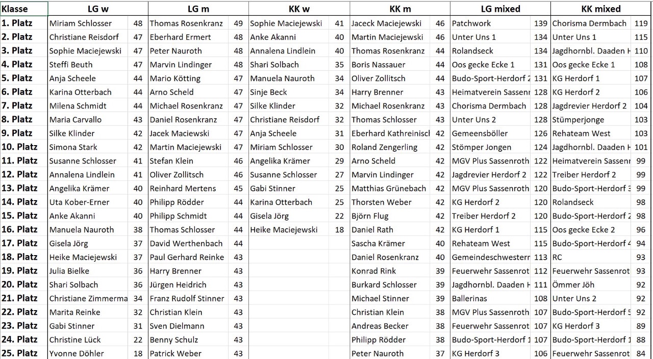 Zu guter Letzt siegte im Kleinkaliberwettbewerb die Mannschaft Chorisma Dermbach mit 119 Ringen vor Unter Uns 1 (115 Ringe) und dem ASV Hellertal 2 mit 111 Ringen.