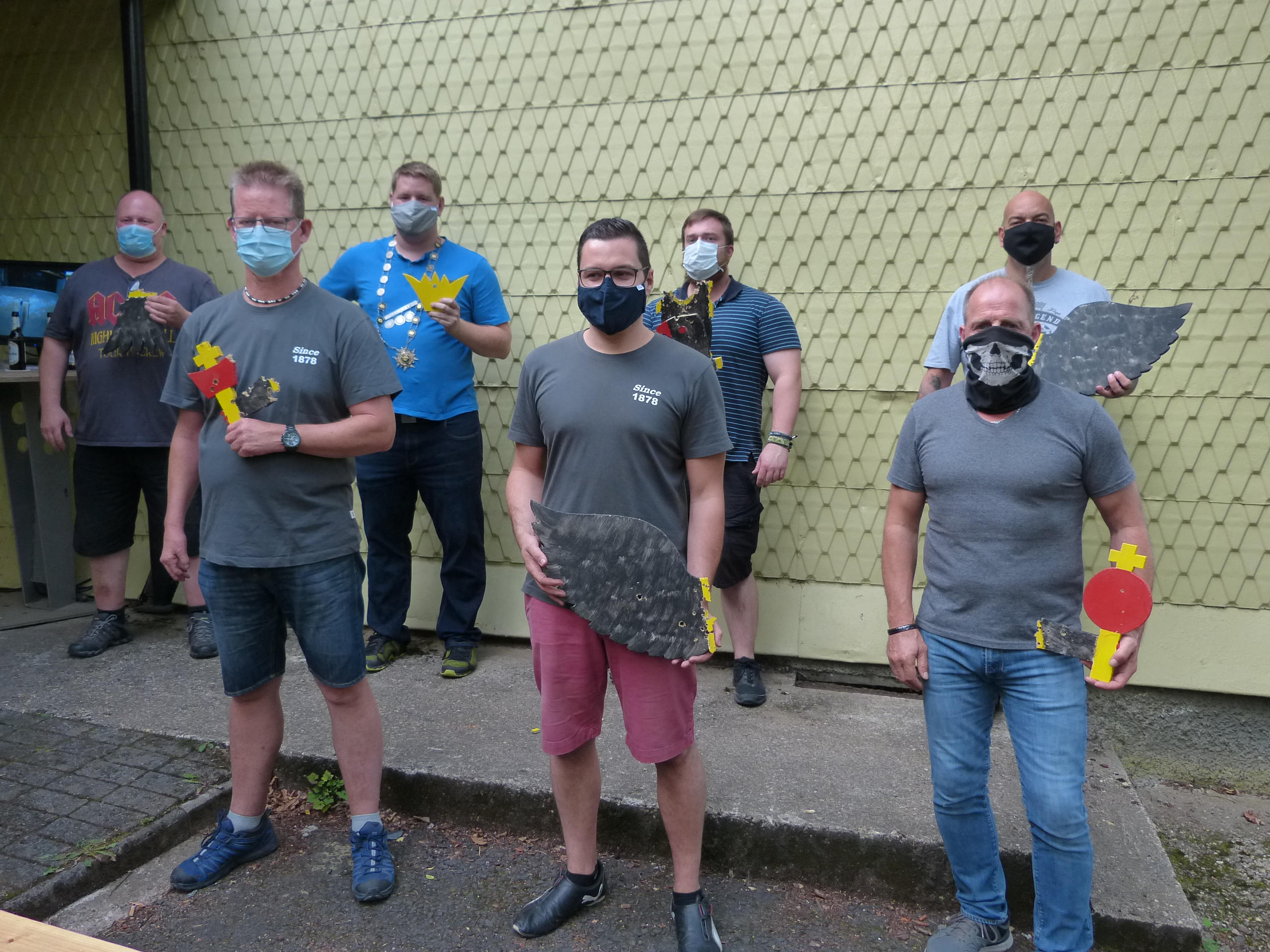 Nach monatelangem coronabedingtem Stillstand im Schützenhaus Herdorf durfte seit einigen Wochen im Schützenhaus Herdorf wieder unter strengen Auflagen trainiert werden. An einen Schützenball mit hundert Gästen zu denken ist aber weiter nicht möglich. Trotzdem haben sich die Schwarzpulverschützen entschlossen auch in diesem Jahr ein Vogelschießen im kleinen Kreis unter strengen Regeln abzuhalten. Es durfte nur der aktuelle Schütze neben der Standaufsicht den Schießstand betreten. Alle anderen mussten draußen an der frischen Luft – bei Gott sei Dank herrlichem Wetter – mit Mindestabstand warten. Den Ehrenschuss auf die lose aufgesetzte Krone hatte Vorjahreskönig Kim Stahl. Der Reichsapfel ging an Michael Gräb ( 32. Schuss), das Zepter an Thomas Schlosser (52.). Den linken Flügel holte sich Chris Vogt (34.), den rechten Marco Solbach (29.). Der Stoß wurde durch Peter Lück (27.) abgeschossen. Mit dem 142. Schuss schoss dann Falk Bernshausen den Vogel von der Stange.