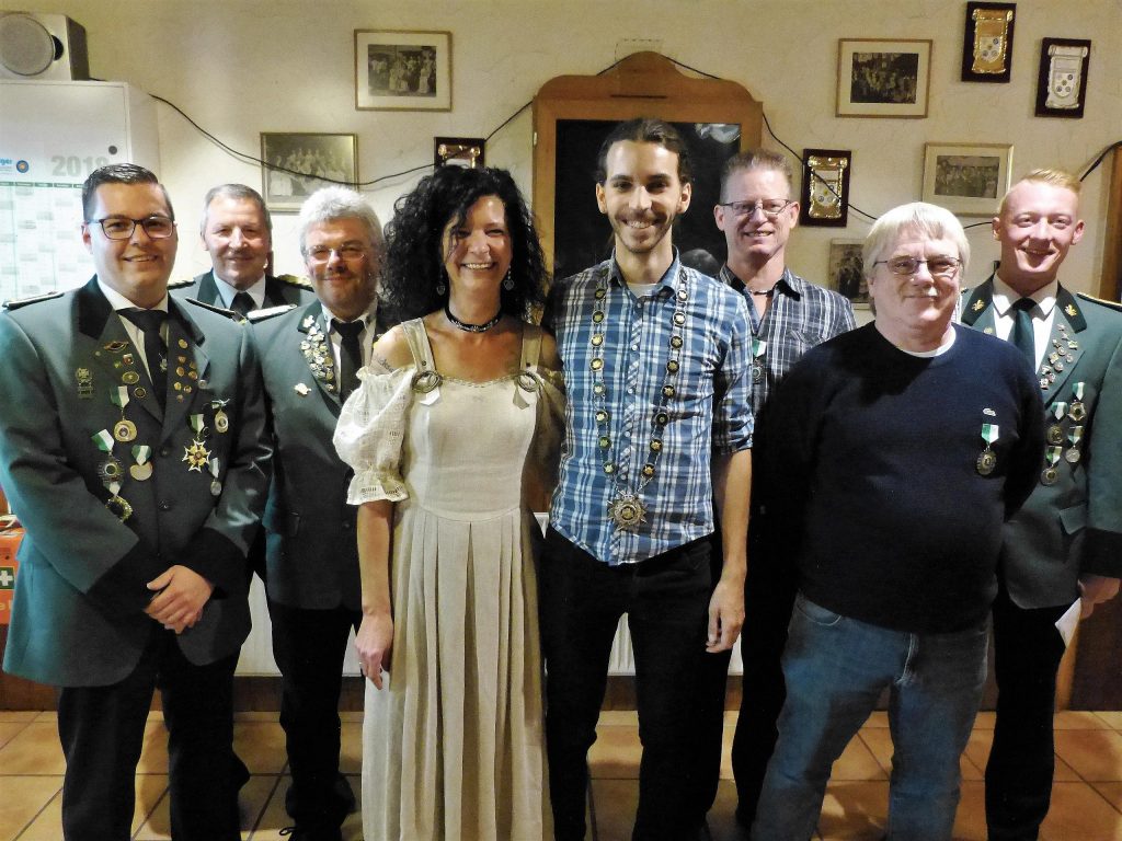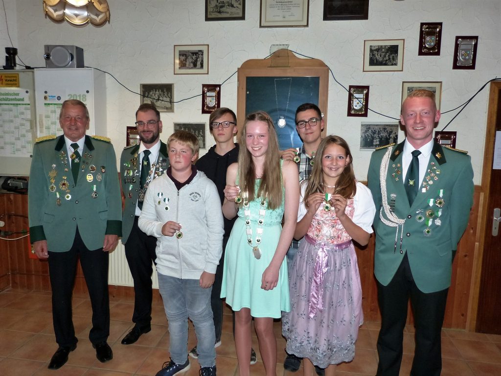 v.links: 2.Vorsitzender Wolfgang Vogt, Jugendleiter Christian Schütz, Tim Schmidt, Lucas Glaser, Jungschützenkönigin Miriam Schlosser, Björn Mulas, Samantha Krah, 1.Vorsitzender Felix Kemper
