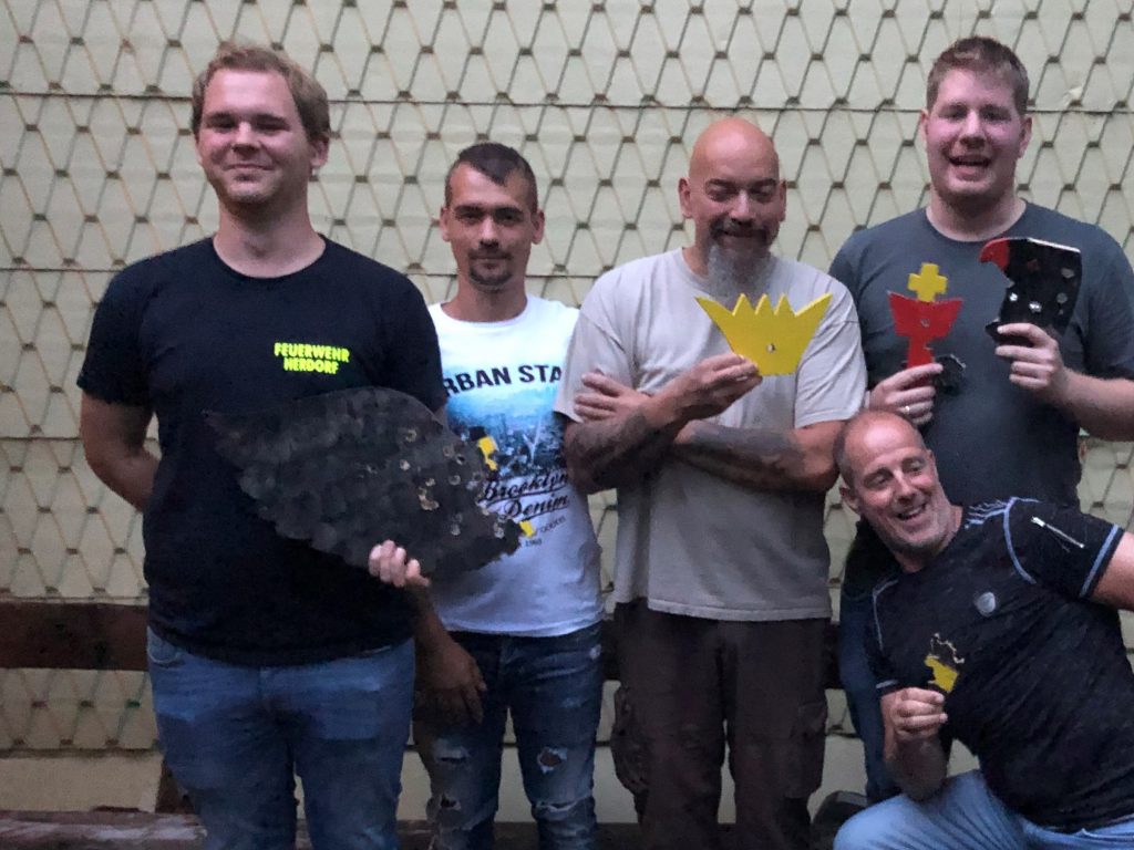 Der von Reinhard Stinner „gebaute“ Vogel der Schwarzpulverschützen erwies sich schon als wesentlich zäher. Den Ehrenschuss hatte der noch amtierende Schwarzpulverkönig Marco Solbach. Er holte sich die traditionell nur lose aufgesetzte Krone mit dem ersten Schuss. Die Ladeprozedur beim Schwarzpulverschießen dauert naturgemäß viel länger als beim Luftgewehr. Da wird erst einmal Pulver von der Laufmündung her eingefüllt. Dann wir die Kugel mit Pflaster in den Lauf gestoßen und danach das Zündhütchen aufgesetzt. So war eine knappe Stunde vergangen als nach 47 Schuss das Zepter durch Kim Stahl fiel. 78 Schüsse später holte sich Ben Szubrin den Apfel. Der linke Flügel ging an Nico Harms (94. Schuss), der rechte Flügel an Michael Gräb ( 44. Schuss). Der Stoß fiel nach 24 Schuss an Bernd Morgenschweis. Nach hartem, spannenden Kampf schickte Kim Stahl nach dem 51. Schuss den Rest des Vogels zu Boden.